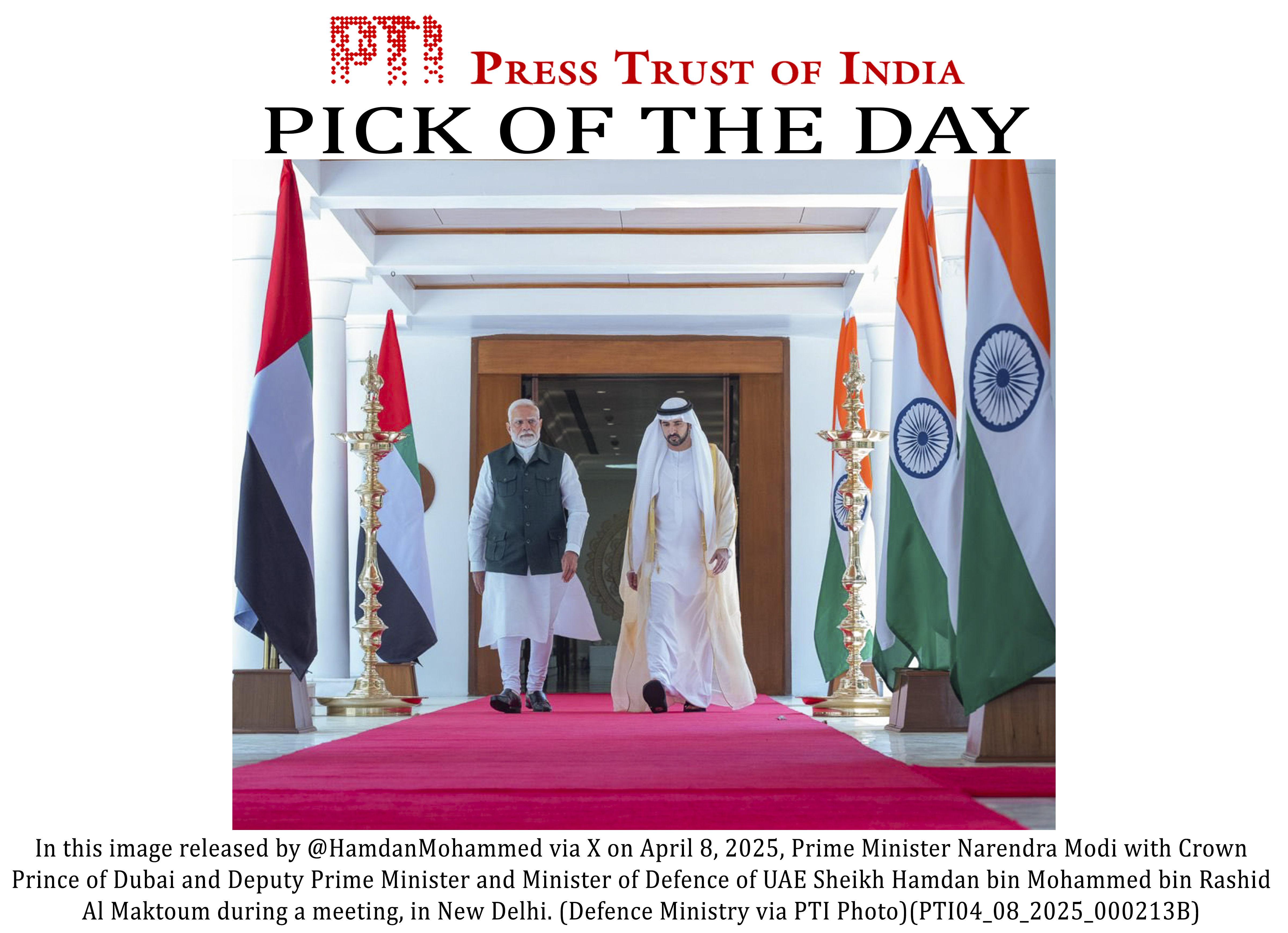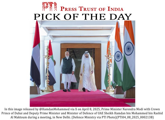 **EDS: THIRD PARTY IMAGE** In this image released by @HamdanMohammed via X on April 8, 2025, Prime Minister Narendra Modi with Crown Prince of Dubai and Deputy Prime Minister and Minister of Defence of UAE Sheikh Hamdan bin Mohammed bin Rashid Al Maktoum during a meeting, in New Delhi. (Defence Ministry via PTI Photo)(PTI04_08_2025_000213B)(PTI04_08_2025_000574B)
