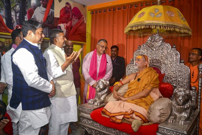 Varanasi: Samajwadi Party MP Virendra Singh during a meeting with Swami Avimukteshwaranand Saraswati, in Varanasi, Monday, Feb. 23, 2026. Days after being booked under the POCSO Act over allegations of sexual abuse of two persons, including a minor, Saraswati on Monday said he will not oppose his arrest even though “the public is watching everything”. (PTI Photo) (PTI02_23_2026_000331B)