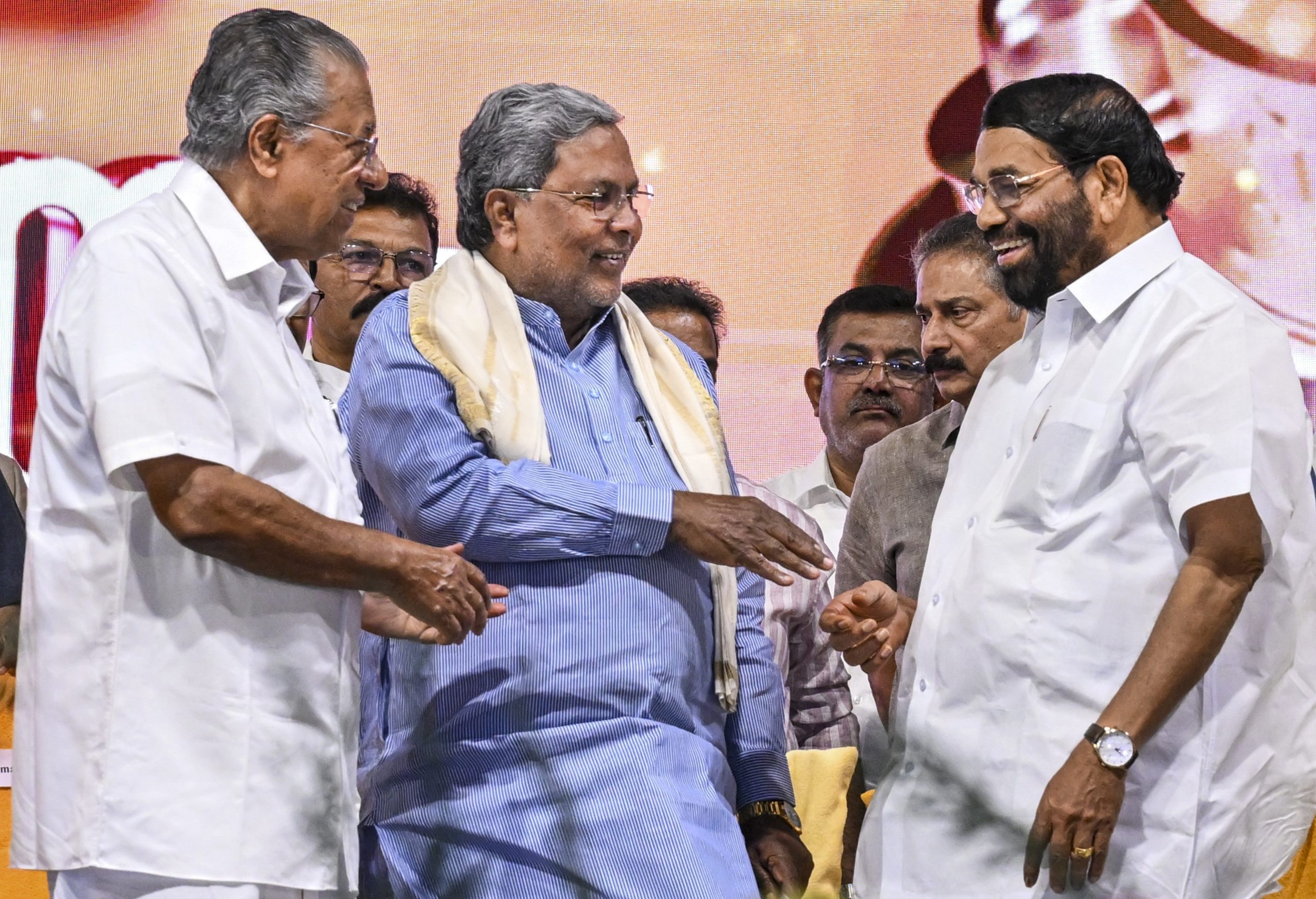 Thiruvananthapuram: Kerala Chief Minister Pinarayi Vijayan, left, with Karnataka CM Siddaramaiah, centre, and Kerala Minister VN Vasavan during the '93rd Sivagiri pilgrimage session', at Varkala in Thiruvananthapuram, Wednesday, Dec. 31, 2025. (PTI Photo)(PTI12_31_2025_000399B)