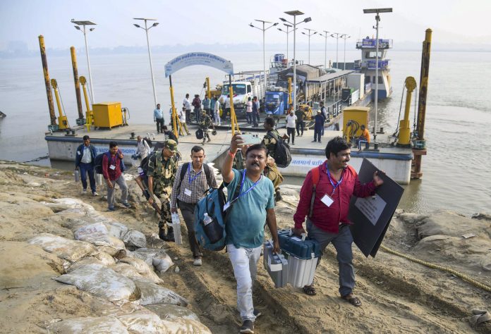 Patna: Polling officials and security personnel deboard a ferry as they leave for election duty on the eve of the first phase of the Bihar Assembly elections, in Patna, Wednesday, Nov. 5, 2025. (PTI Photo)(PTI11_05_2025_000423B)
