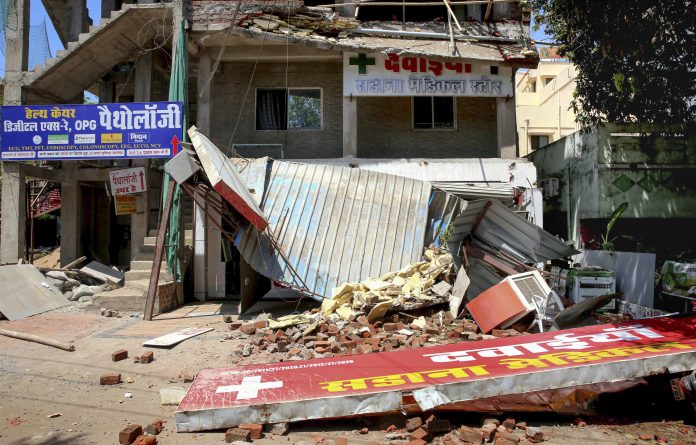 Bhopal: Debris scattered around after a portion of an under-construction four-storey building collapsed near AIIMS Bhopal, Friday, March 27, 2026. (PTI Photo) (PTI03_27_2026_000301B)