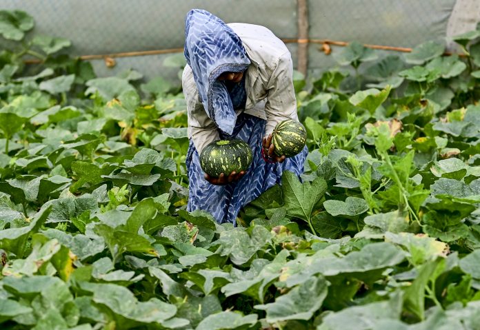 Prayagraj: A woman farmer harvests pumpkins in a field situated on the bank of the River Ganga, in Prayagraj, Tuesday, March 31, 2026. (PTI Photo)(PTI03_31_2026_000015B)