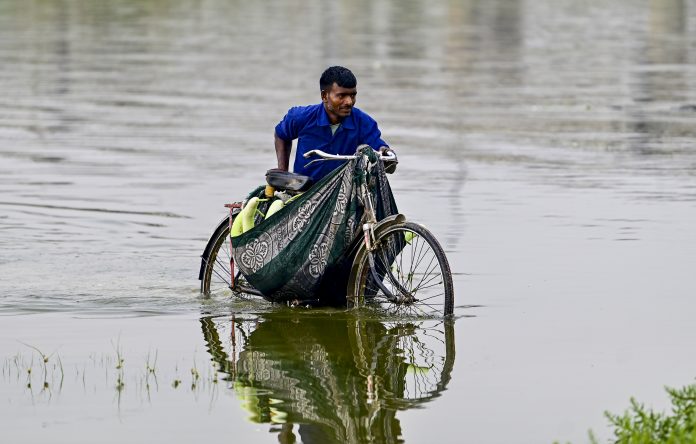 Prayagraj: A farmer carries harvested bottle gourds through the waters of the River Ganga, in Prayagraj, Tuesday, March 31, 2026. (PTI Photo)(PTI03_31_2026_000014B)