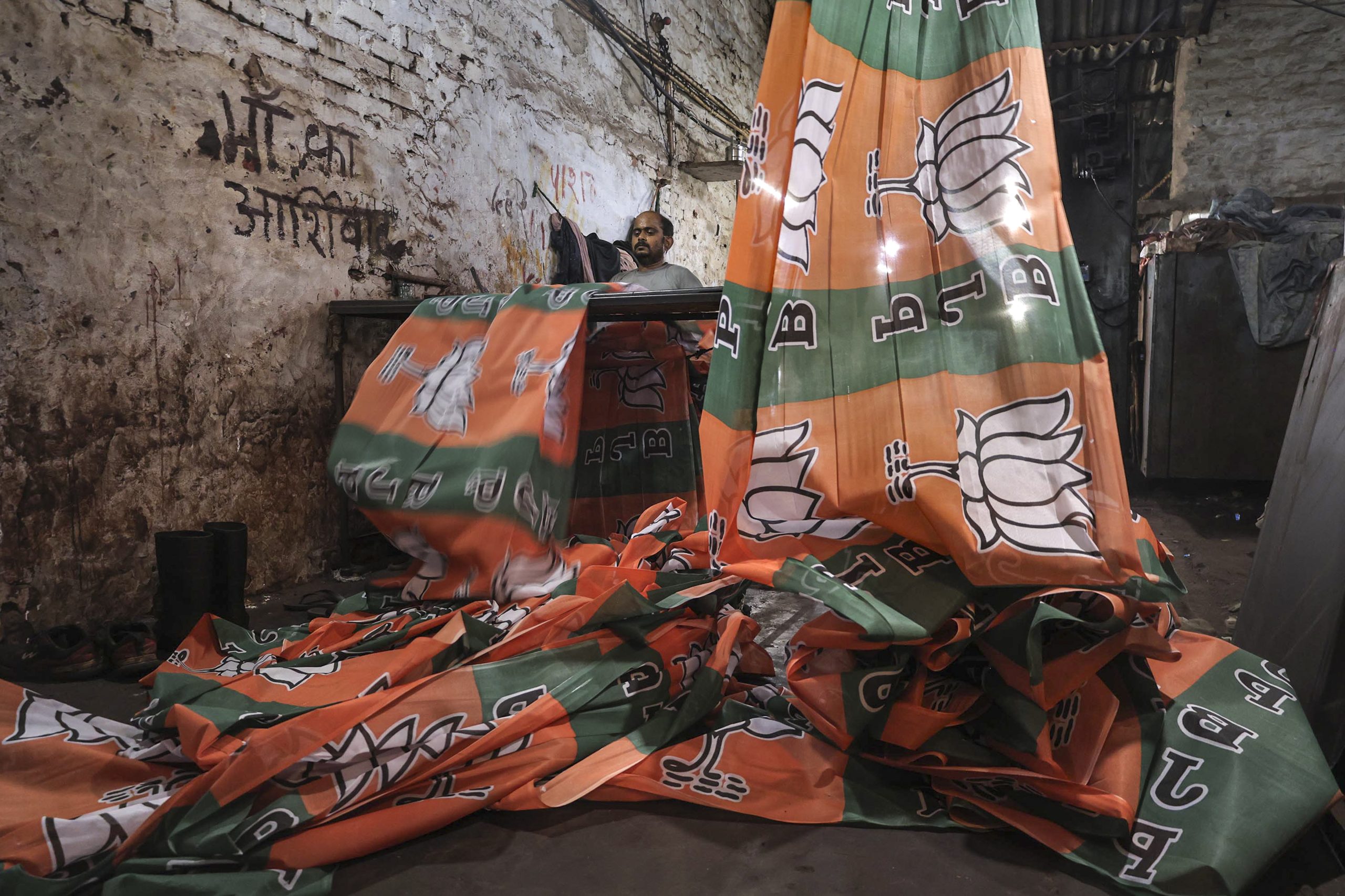 Mathura: A worker makes flags depicting the BJP party logo ahead of the election in various constituencies, in Mathura, Wednesday, March 25, 2026. (PTI Photo) (PTI03_25_2026_000200B)