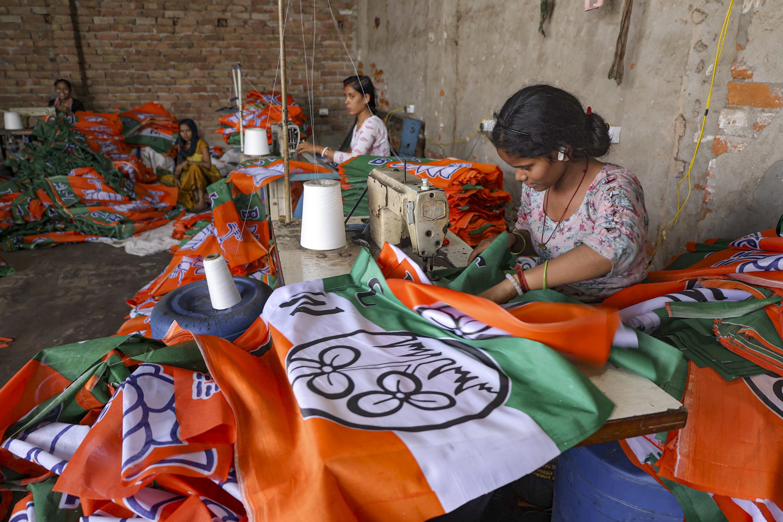 Mathura: A worker makes flags depicting the TMC party logo ahead of the election in various constituencies, in Mathura, Wednesday, March 25, 2026. (PTI Photo) (PTI03_25_2026_000203B)