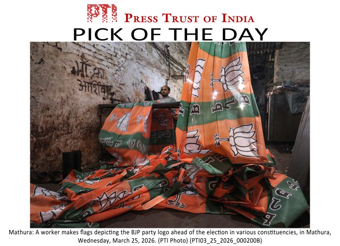 PLS TAKE NOTE OF THIS PTI PICK OF THE DAY::: Mathura: A worker makes flags depicting the BJP party logo ahead of the election in various constituencies, in Mathura, Wednesday, March 25, 2026. (PTI Photo) (PTI03_25_2026_000200B)(PTI03_25_2026_000309B)