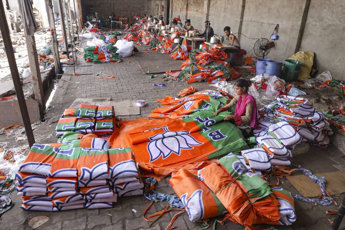 Mathura: Workers make flags depicting the BJP party logo ahead of the election in various constituencies, in Mathura, Wednesday, March 25, 2026. (PTI Photo) (PTI03_25_2026_000204B)