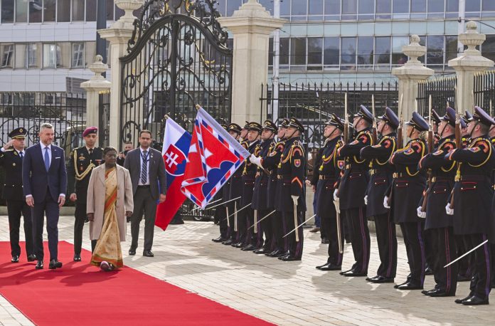 **EDS: THIRD PARTY** In this image provided by RB on Wednesday, Apr. 9, 2025, President Droupadi Murmu with Slovak President Peter Pellegrini inspects a ceremonial guard of honour at the President’s Palace in Bratislava, Slovakia. (PTI Photo) (PTI04_09_2025_000146B)