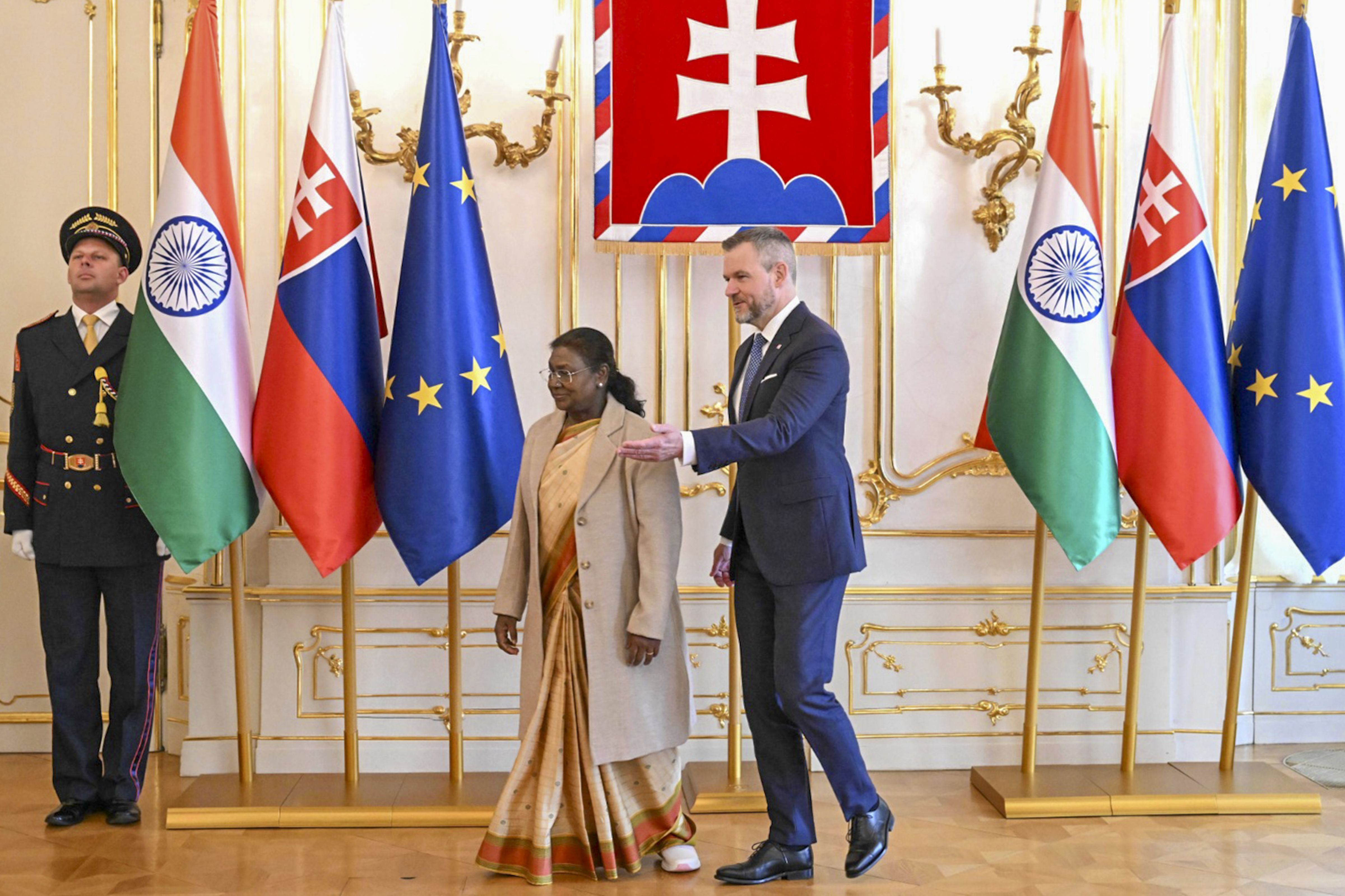 **EDS: THIRD PARTY** In this image provided by RB on Wednesday, Apr. 9, 2025, President Droupadi Murmu being welcomed by Slovak President Peter Pellegrini at the President’s Palace in Bratislava, Slovakia. (PTI Photo) (PTI04_09_2025_000151B)