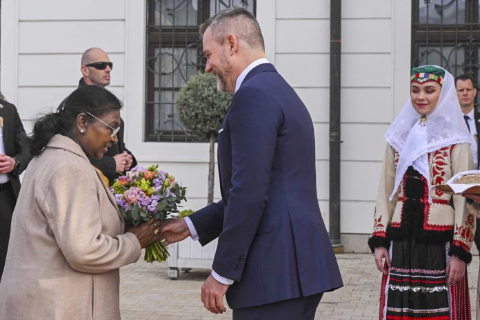 **EDS: THIRD PARTY** In this image provided by RB on Wednesday, Apr. 9, 2025, President Droupadi Murmu being welcomed by Slovak President Peter Pellegrini at the President’s Palace in Bratislava, Slovakia. (PTI Photo) (PTI04_09_2025_000150B)