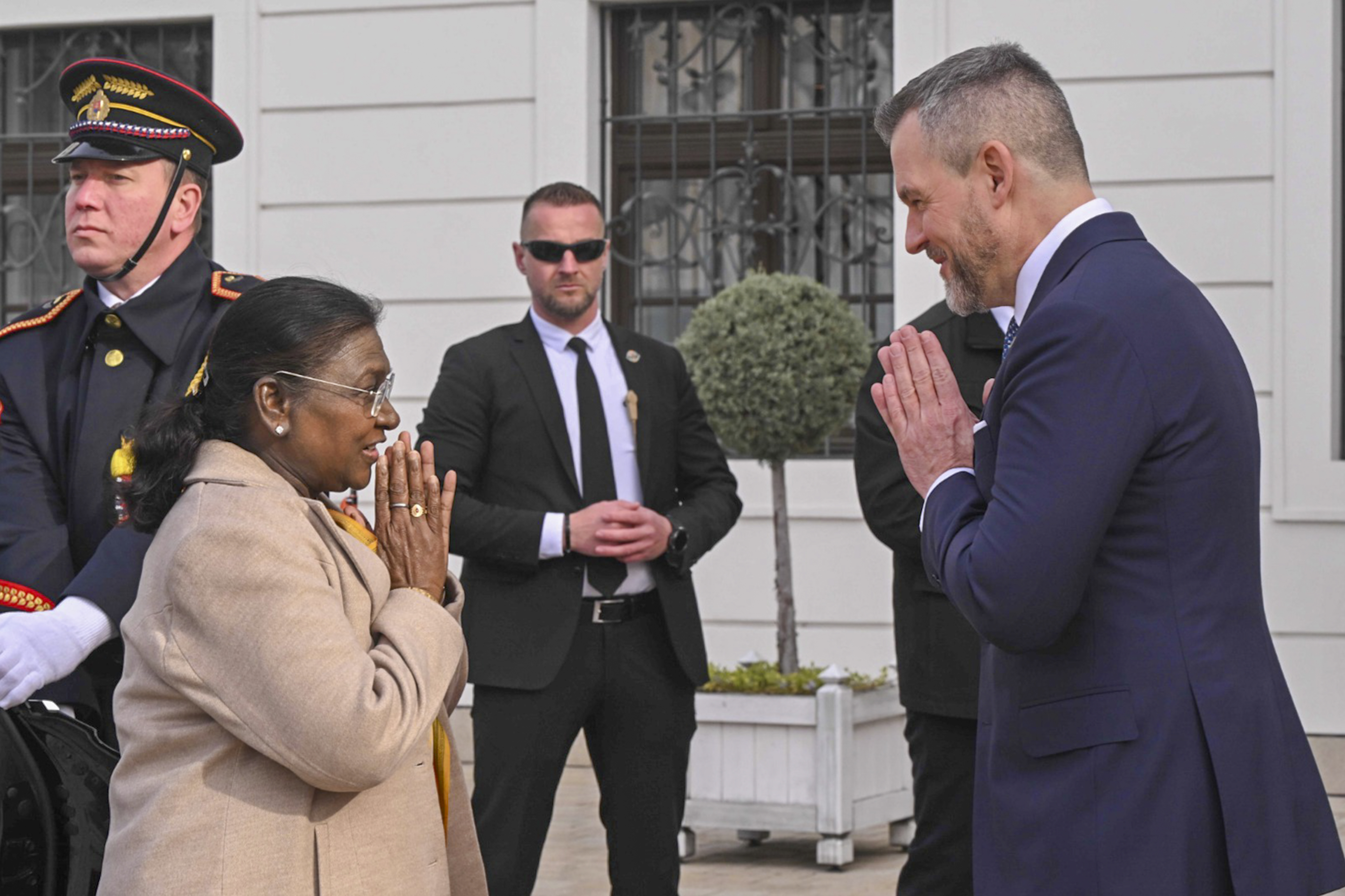 **EDS: THIRD PARTY** In this image provided by RB on Wednesday, Apr. 9, 2025, President Droupadi Murmu being welcomed by Slovak President Peter Pellegrini at the President's Palace in Bratislava, Slovakia. (PTI Photo) (PTI04_09_2025_000149B)