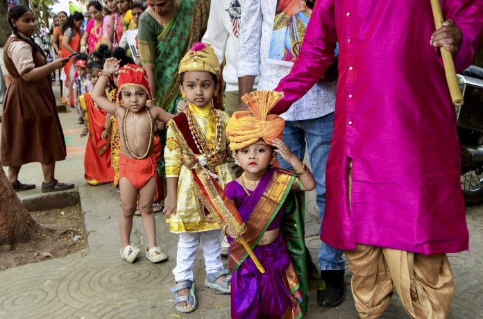 Mumbai: Playgroup children dressed in various costumes participate in a welcome procession on the eve of the Marathi New Year Gudi Padwa at Lower Parel, in Mumbai, Wednesday, March 18, 2026. (PTI Photo)(PTI03_18_2026_000186B)