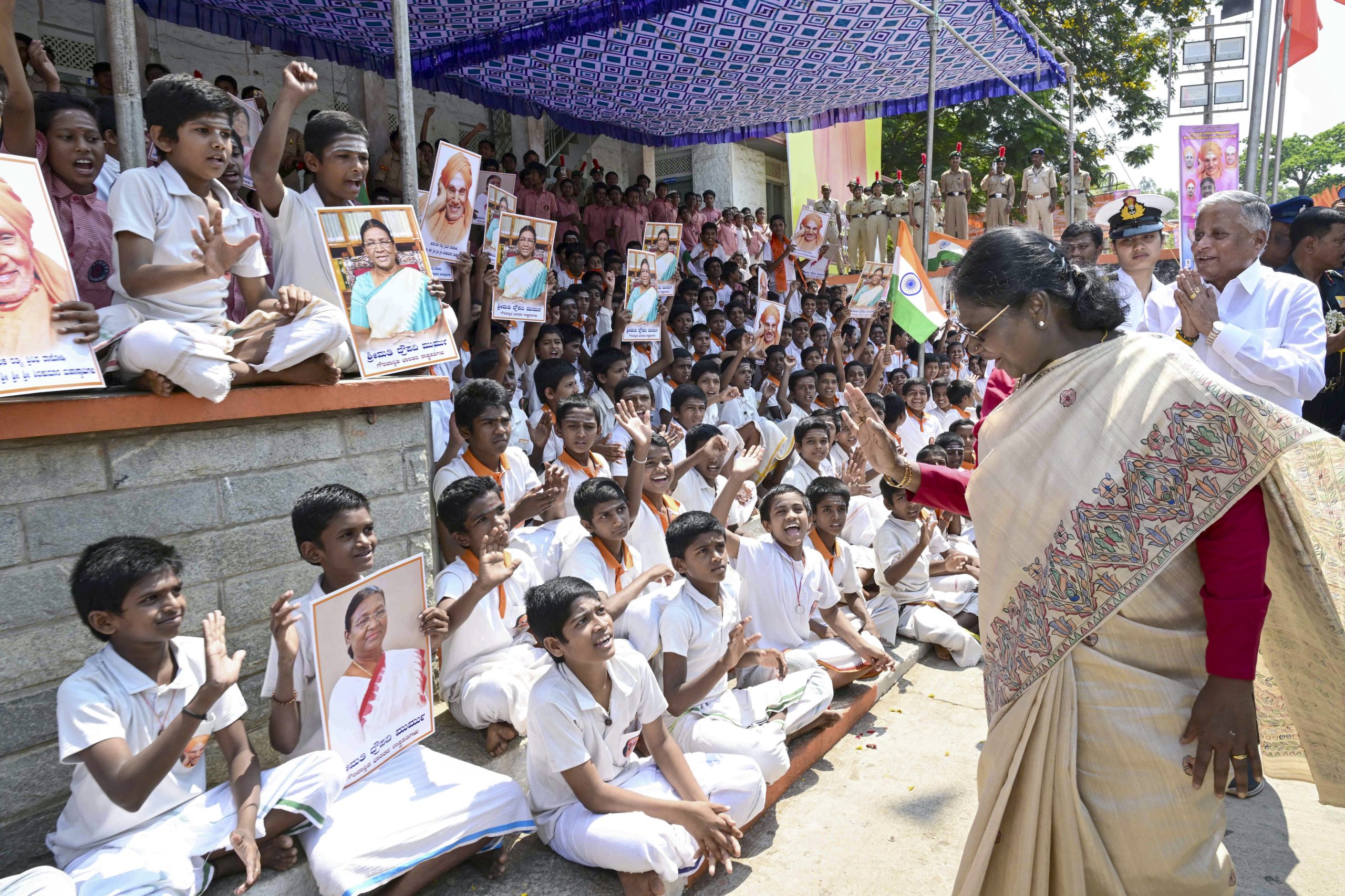 **EDS: THIRD PARTY IMAGE** In this image received on April 1, 2026, President Droupadi Murmu greets children during the 119th birth anniversary celebrations and Guruvandana Mahotsava of spiritual leader and educator Shivakumara Swami, in Tumakuru, Karnataka. (Rashtrapati Bhavan via PTI Photo)(PTI04_01_2026_000169B)