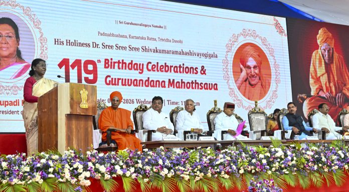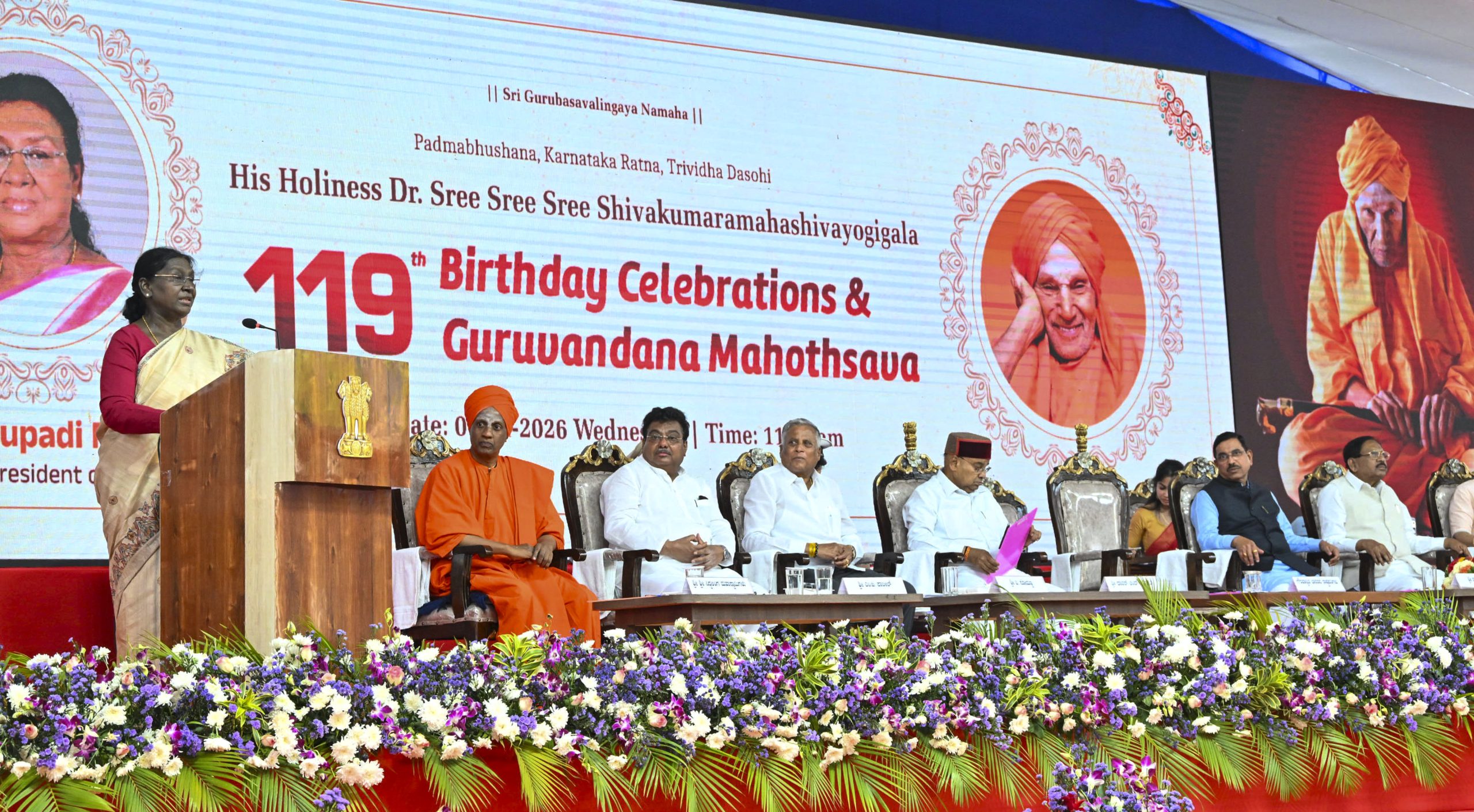 **EDS: THIRD PARTY IMAGE** In this image received on April 1, 2026, President Droupadi Murmu addresses during the 119th birth anniversary celebrations and Guruvandana Mahotsava of spiritual leader and educator Shivakumara Swami, in Tumakuru, Karnataka. (Rashtrapati Bhavan via PTI Photo)(PTI04_01_2026_000168B)