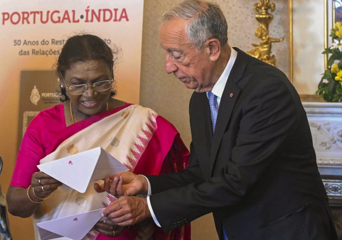 **EDS: THIRD PARTY IMAGE** In this image released by @rashtrapatibhvn via X on Monday, April 7, 2025, President Droupadi Murmu with President of Portugal Marcelo Rebelo de Sousa during the joint release of a commemorative stamp celebrating 50 years of diplomatic relations between the two countries, in Portugal. (@rashtrapatibhvn on X via PTI Photo)(PTI04_07_2025_000308B) *** Local Caption ***