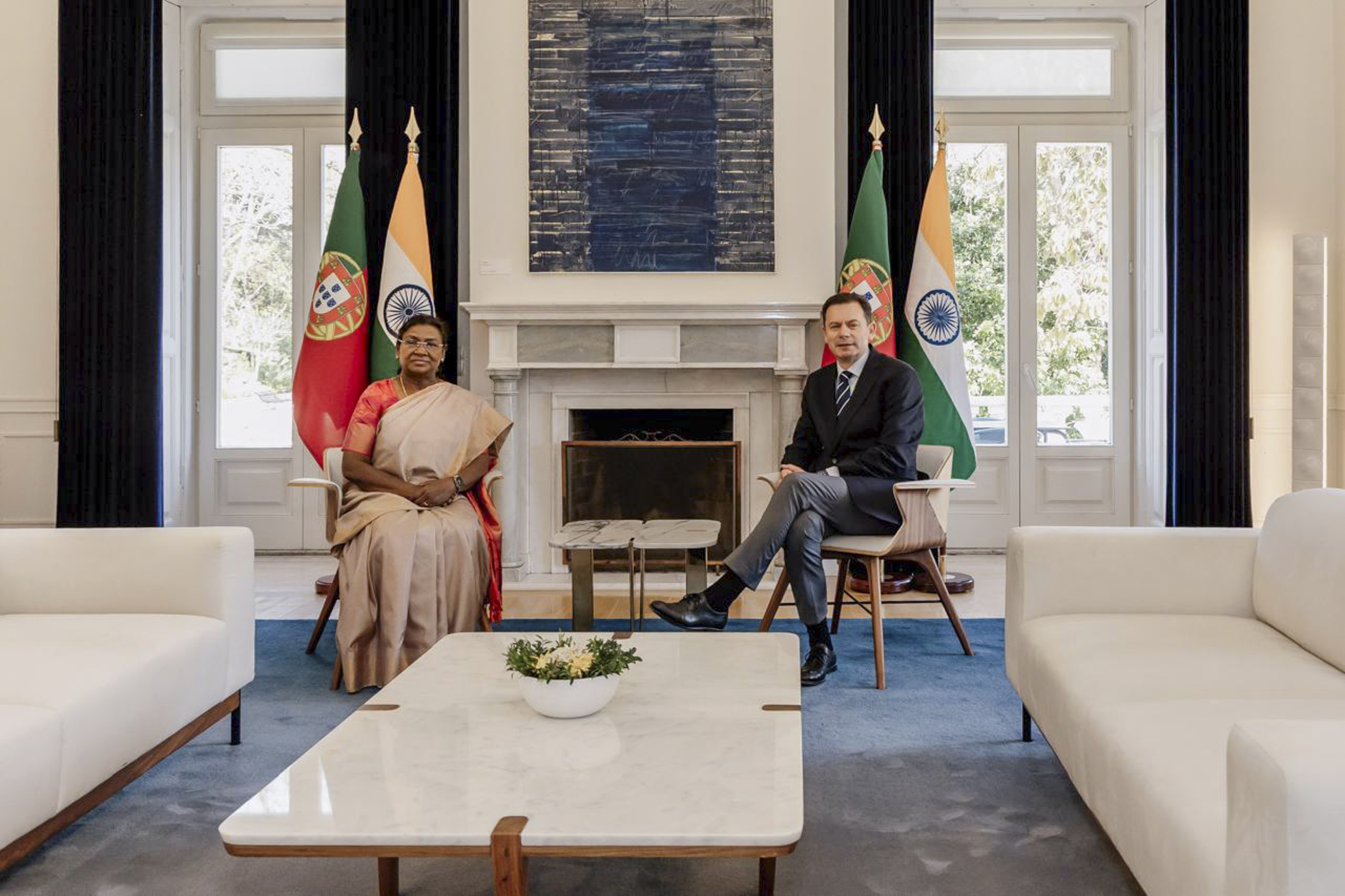 **EDS: THIRD PARTY IMAGE** In this handout image, President Droupadi Murmu during a meeting with Portuguese Prime Minister Luís Montenegro, in Portugal, Tuesday, April 8, 2025. (PTI Photo)(PTI04_08_2025_000501B)