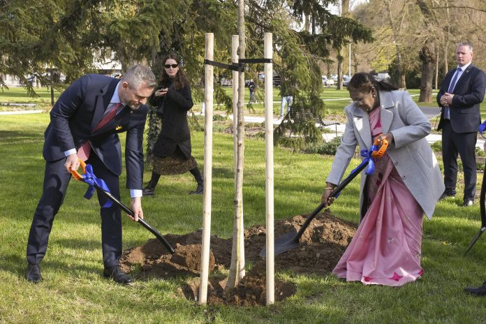 **EDS: THIRD PARTY IMAGE** In this image released by the Rashtrapati Bhavan on April 10, 2025, President Droupadi Murmu and Slovak President Peter Pellegrini jointly plant a Linden tree, the country�s national tree, in Nitra, Slovakia. (Rashtrapati Bhavan via PTI Photo) (PTI04_10_2025_000444B)