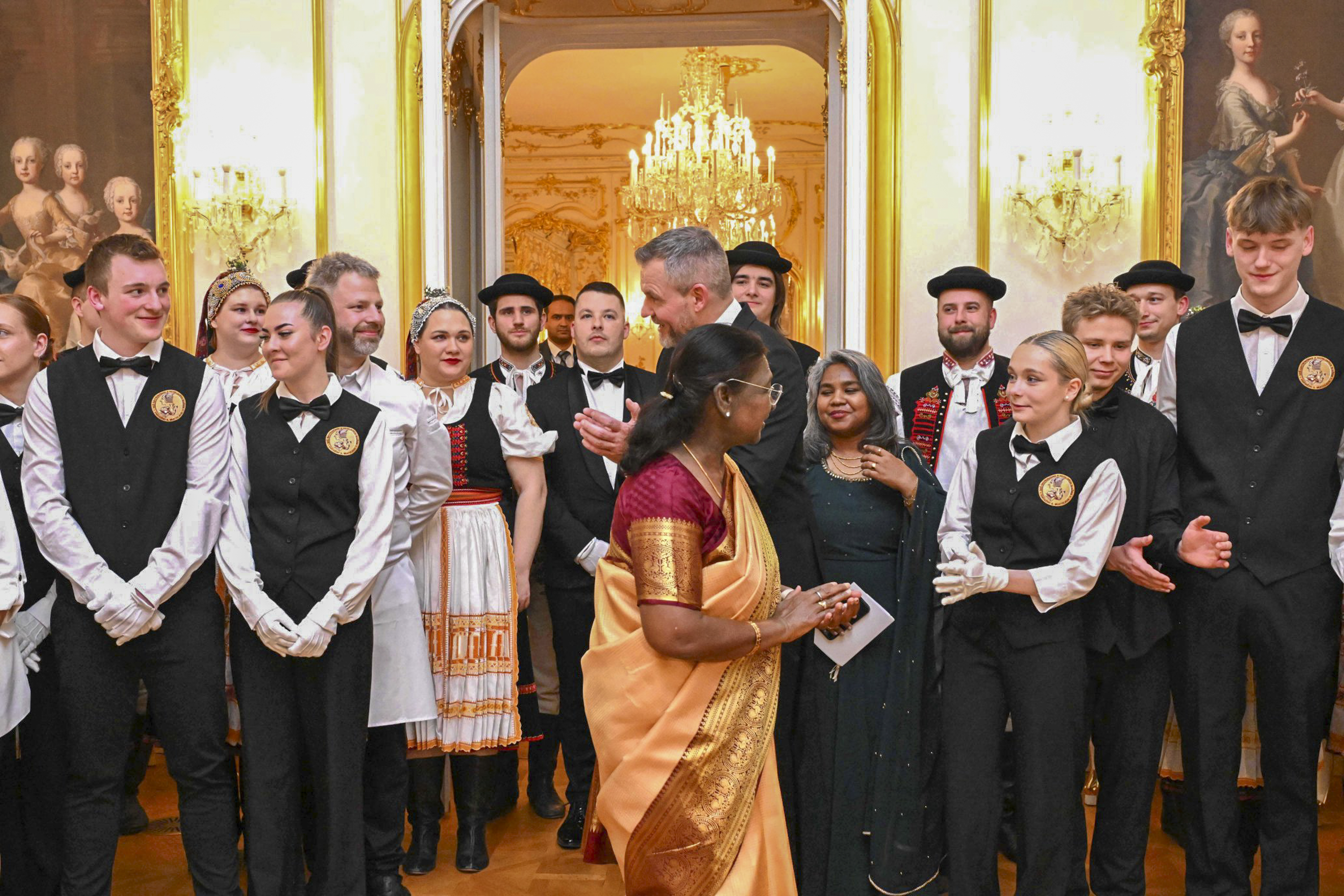 **EDS: THIRD PARTY IMAGE** In this image released by @rashtrapatibhvn via X on April 10, 2025, President Droupadi Murmu during a banquet hosted in her honour by President Peter Pellegrini at the historic Bratislava Castle, in Slovakia. (@rashtrapatibhvn on X via PTI Photo)(PTI04_10_2025_000067B)