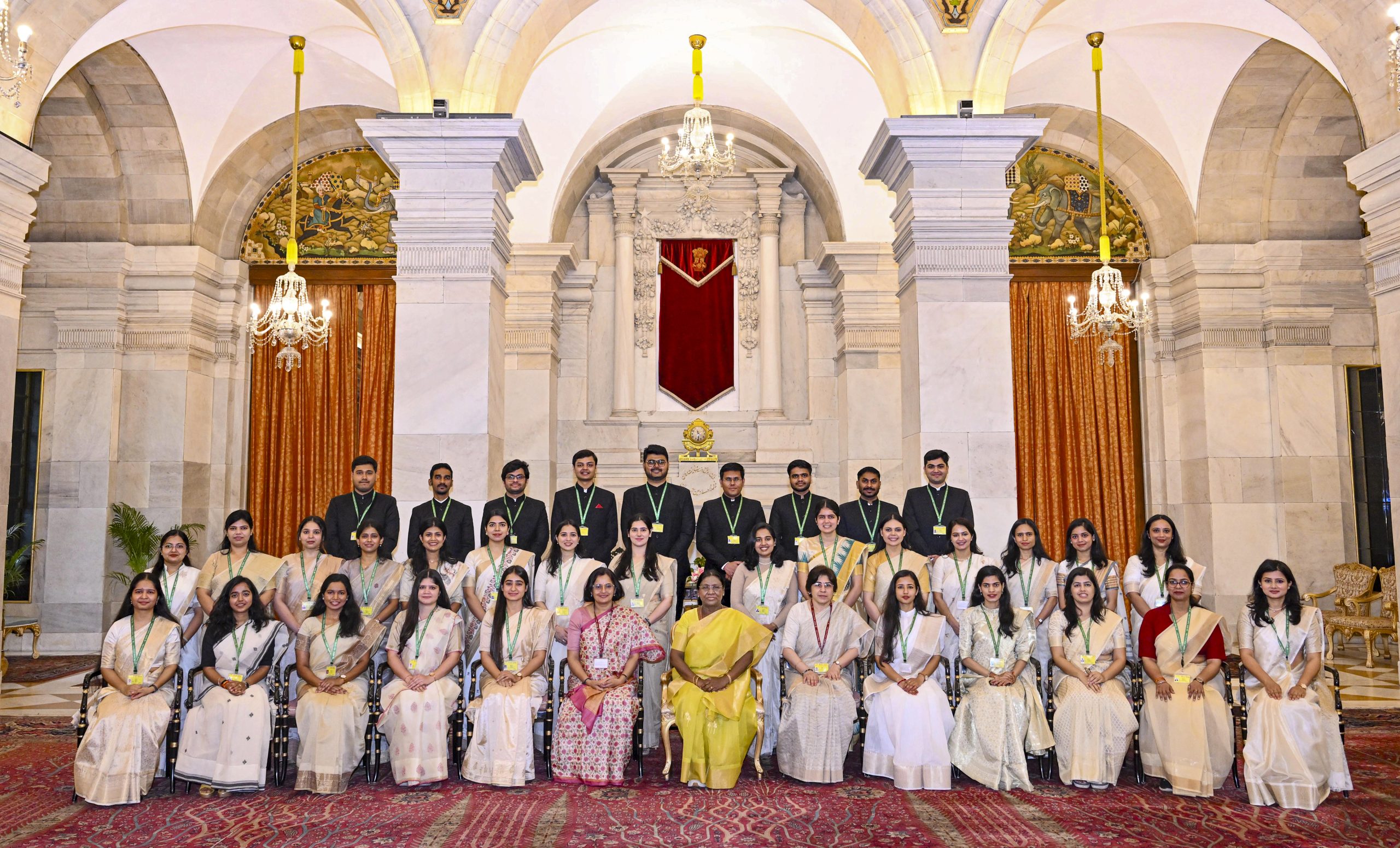 **EDS: THIRD PARTY IMAGE** In this image received on March 27, 2026, President Droupadi Murmu poses for a group photograph with officers of the Central Power Engineering Service (CPES) and Indian Economic Service (IES) at Rashtrapati Bhavan, in New Delhi. (Rashtrapati Bhavan via PTI Photo)(PTI03_27_2026_000132B)