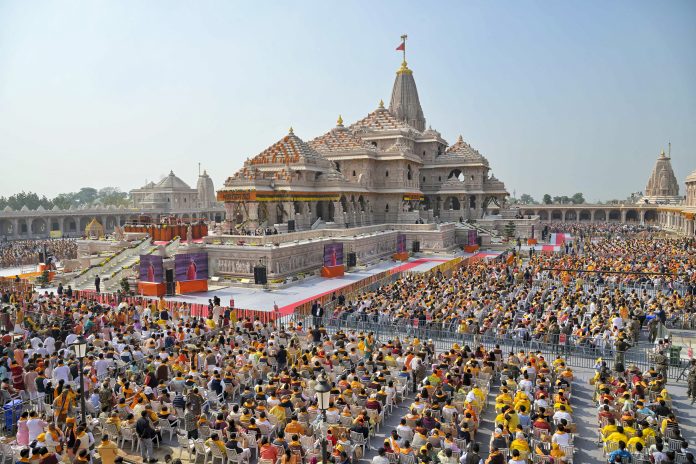 **EDS: THIRD PARTY IMAGE** In this image received on Nov. 25, 2025, People attend the ‘Dhwajarohan’ ceremony at the Ram Temple, in Ayodhya, Uttar Pradesh. (PMO via PTI Photo)(PTI11_25_2025_000354B)