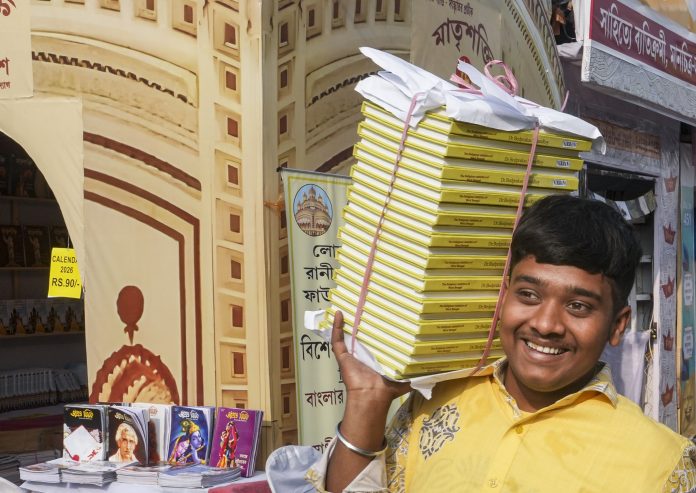 Kolkata: A visitor carries books during the 49th International Kolkata Book Fair, in Kolkata, West Bengal, Sunday, Jan. 25, 2026. (PTI Photo/Manvender Vashist Lav)(PTI01_25_2026_000398B)