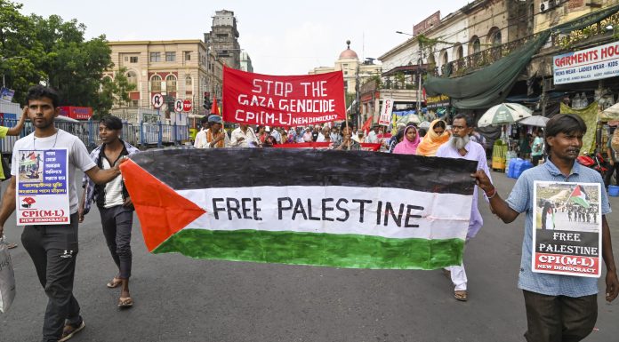Kolkata: Members of CPI(M-L) participate in a protest march in support of Palestinians amid the ongoing war in Gaza, in Kolkata, Tuesday, April 8, 2025. (PTI Photo)(PTI04_08_2025_000354B)