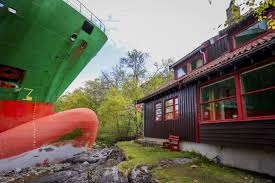 Images show the ship’s red and green bow just metres (yards) from Helberg’s house along the Trondheim Fjord’s coast.