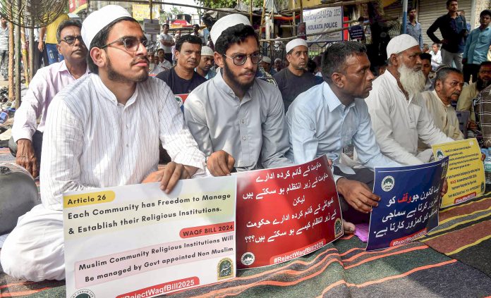 Kolkata: Members of Citizen’s Forum for Social Stand stage a protest against the passage of the Waqf (Amendment) Bill, 2025, in the Parliament, in Kolkata, Tuesday, April 8, 2025. (PTI Photo)(PTI04_08_2025_000355B)