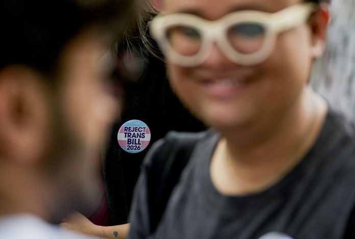 New Delhi: A supporter of the LGBTQIA+ community wears a badge during a protest against the passage of the Transgender Persons (Protection of Rights) Amendment Bill, 2026, at Jantar Mantar in New Delhi, Sunday, March 29, 2026. (PTI Photo/Salman Ali)(PTI03_29_2026_000109B)