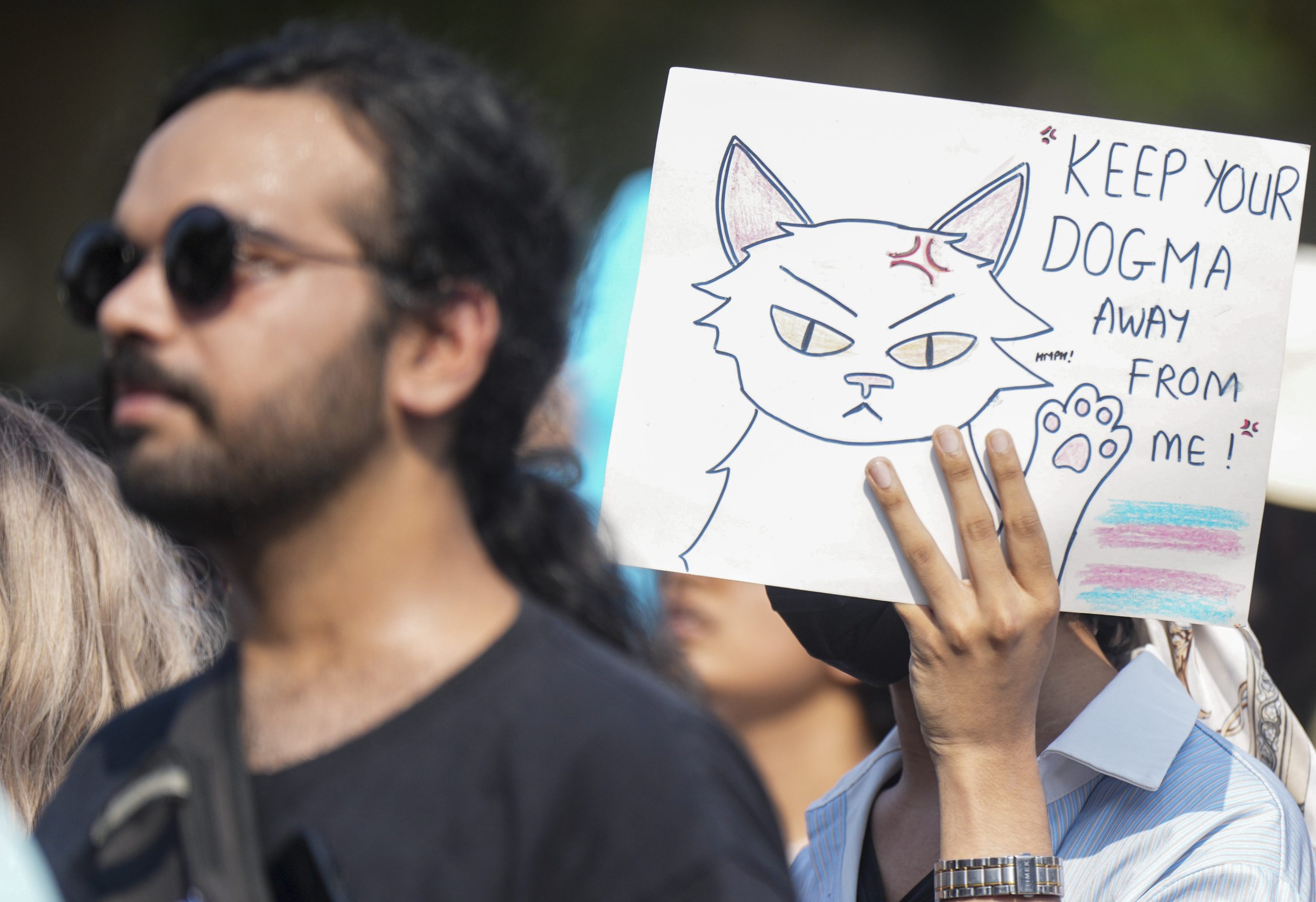 Mumbai: A member of the LGBTQIA+ community holds a placard during a protest against the passage of the Transgender Persons (Protection of Rights) Amendment Bill, 2026, in the Lok Sabha, at Azad Maidan, in Mumbai, Wednesday, March 25, 2026. (PTI Photo/Shashank Parade) (PTI03_25_2026_000272B)