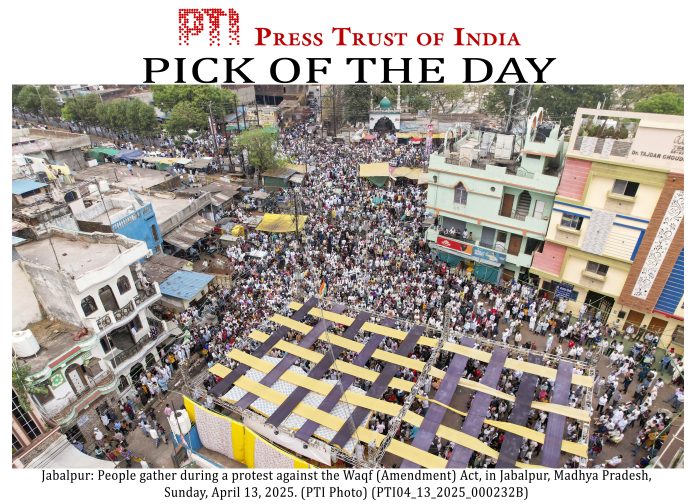 PLS TAKE NOTE OF THIS PTI PICK OF THE DAY::: Jabalpur: People gather during a protest against the Waqf (Amendment) Act, in Jabalpur, Madhya Pradesh, Sunday, April 13, 2025. (PTI Photo) (PTI04_13_2025_000232B)(PTI04_13_2025_000272B)