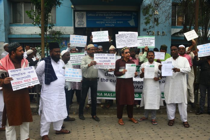 Siliguri: Siliguri Jama Masjid committee members hold posters in protest against the Waqf (Amendment) Act, outside the Office of the Sub-Divisional Officer, in Siliguri, West Bengal, Friday, April 11, 2025. (PTI Photo) (PTI04_11_2025_000640B)