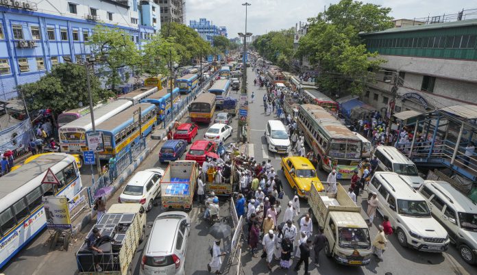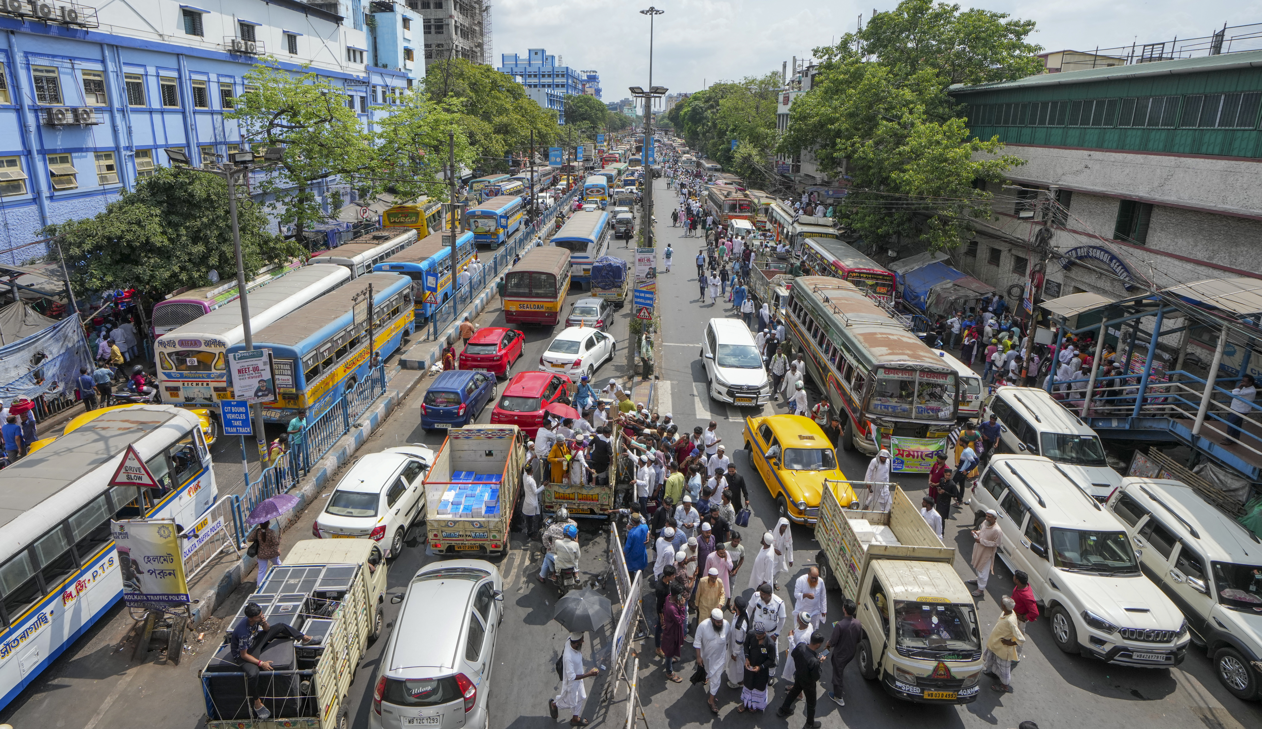 Kolkata: Vehicles stuck in a traffic jam as members of the Muslim community gather to protest against the Waqf (Amendment) Bill 2025, in Kolkata, Thursday, April 10, 2025. (PTI Photo/Swapan Mahapatra)(PTI04_10_2025_000185B)