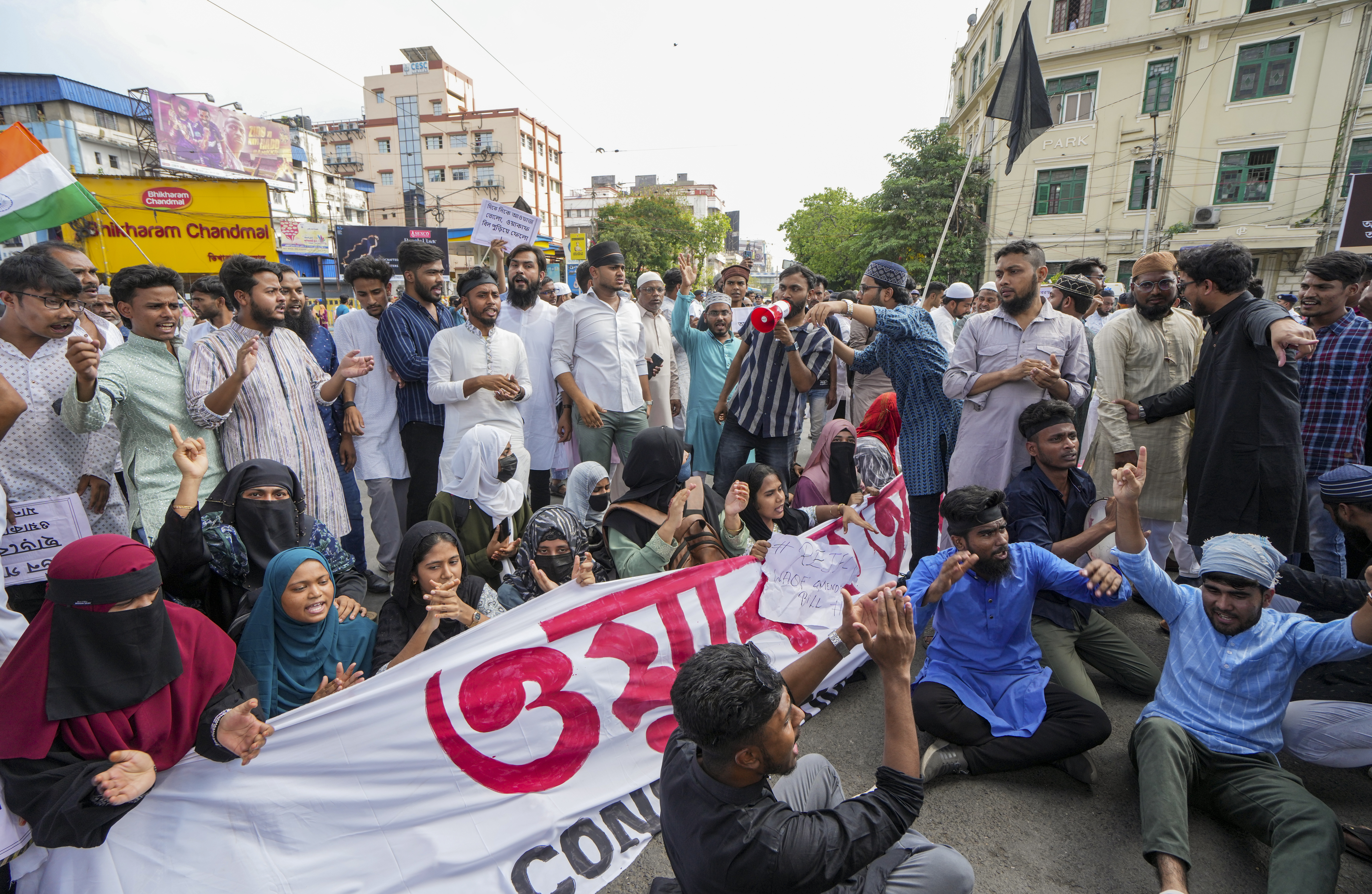 Kolkata: Students of Aliah University stage a protest against the Waqf (Amendment) Bill 2025, in Kolkata, Friday, April 11, 2025. (PTI Photo/Swapan Mahapatra)(PTI04_11_2025_000205B)