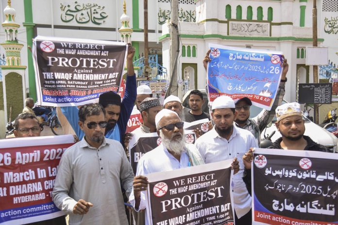 Hyderabad: Agitators under the banner of the Joint Action Committee (JAC) hold placards during a demonstration against the Waqf (Amendment) Bill 2025, after Friday prayers, in Hyderabad, Friday, April 11, 2025. (PTI Photo)(PTI04_11_2025_000206B)