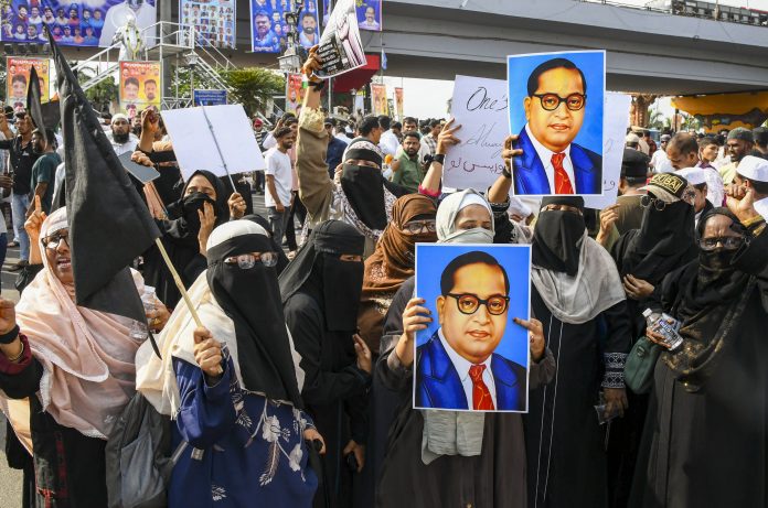 Hyderabad: People hold portraits of Dr BR Ambedkar during a protest against the Waqf (Amendment) Act, on the eve of ‘Ambedkar Jayanti’, in Hyderabad, Telangana, Sunday, April 13, 2025. (PTI Photo) (PTI04_13_2025_000259B)