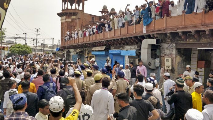 Agra: Police personnel try to pacify agitators during a protest after a person was arrested for allegedly placing a piece of animal flesh at Jama Masjid, in Agra, Friday, April 11, 2025. (PTI Photo)(PTI04_11_2025_000251B)