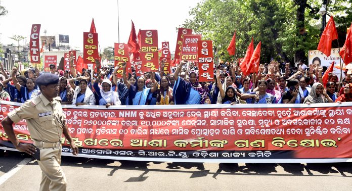 Bhubaneswar: Odisha State ASHA Workers’ Association workers stage a protest over a 19-point charter of demands, in Bhubaneswar, Thursday, April 2, 2026. (PTI Photo) (PTI04_02_2026_000223B)
