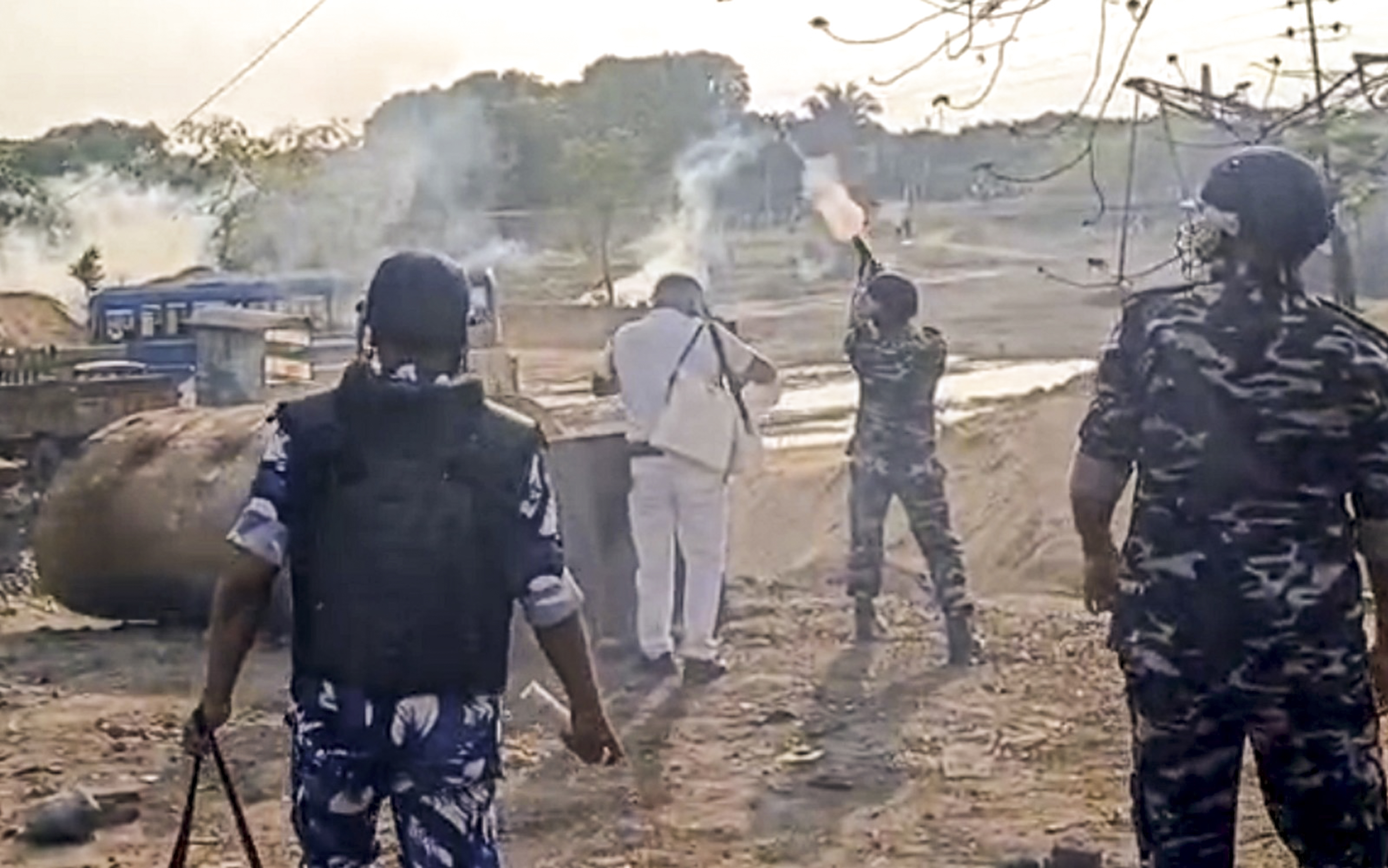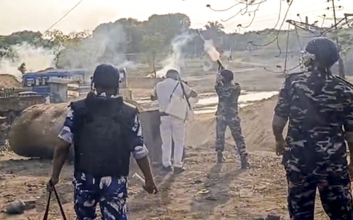 Murshidabad: Security personnel use tear gas to disperse demonstrators during a protest against Waqf (Amendment) Act, in Murshidabad district, Friday, April 11, 2025. (PTI Photo) (PTI04_11_2025_000572B) *** Local Caption ***