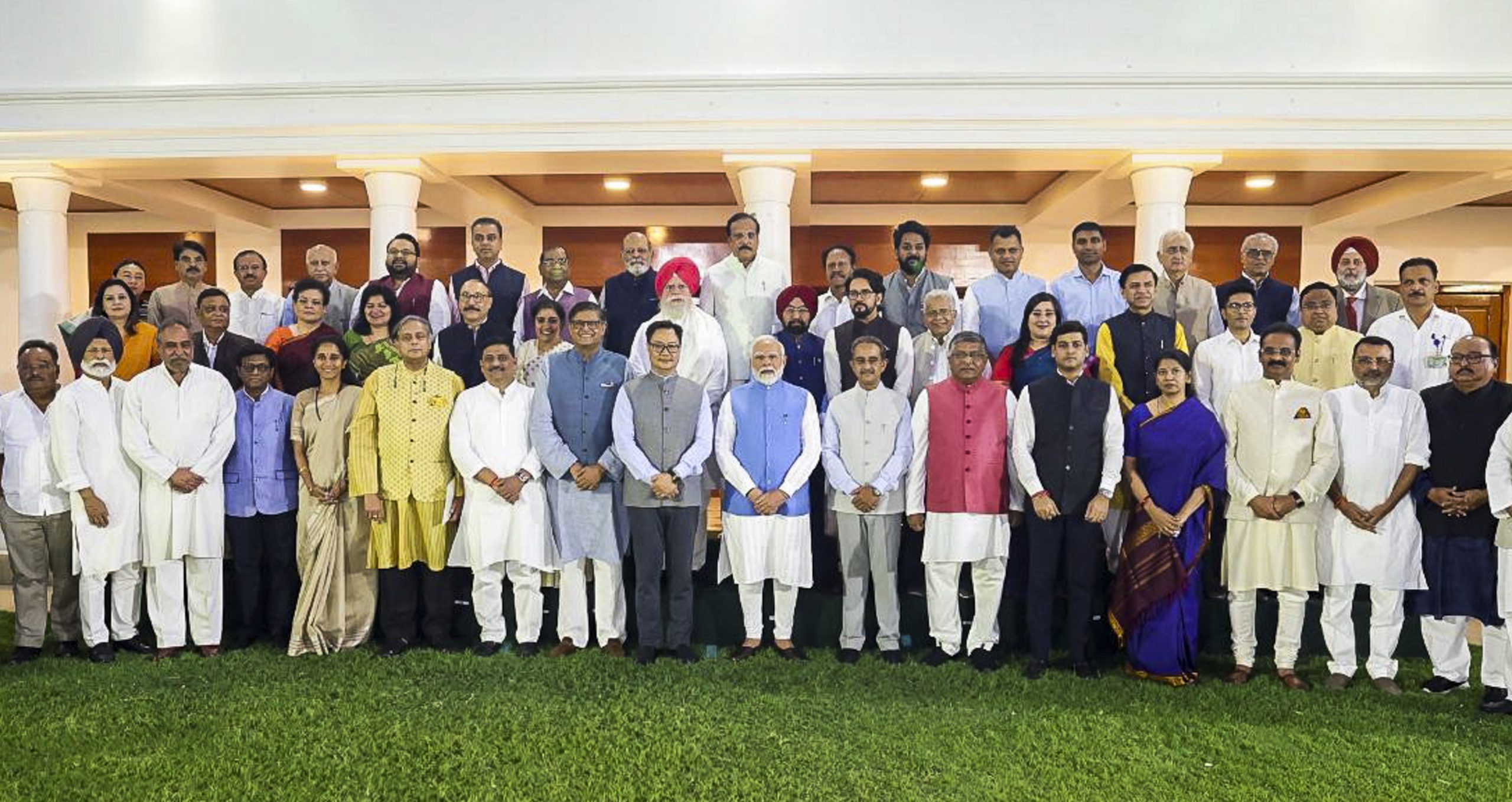 New Delhi: Prime Minister Narendra Modi with members of multi-party delegations which visited various nations, poses for a group picture during a meeting, at his residence in New Delhi, Tuesday, June 10, 2025. (PTI Photo) (PTI06_10_2025_000311B)