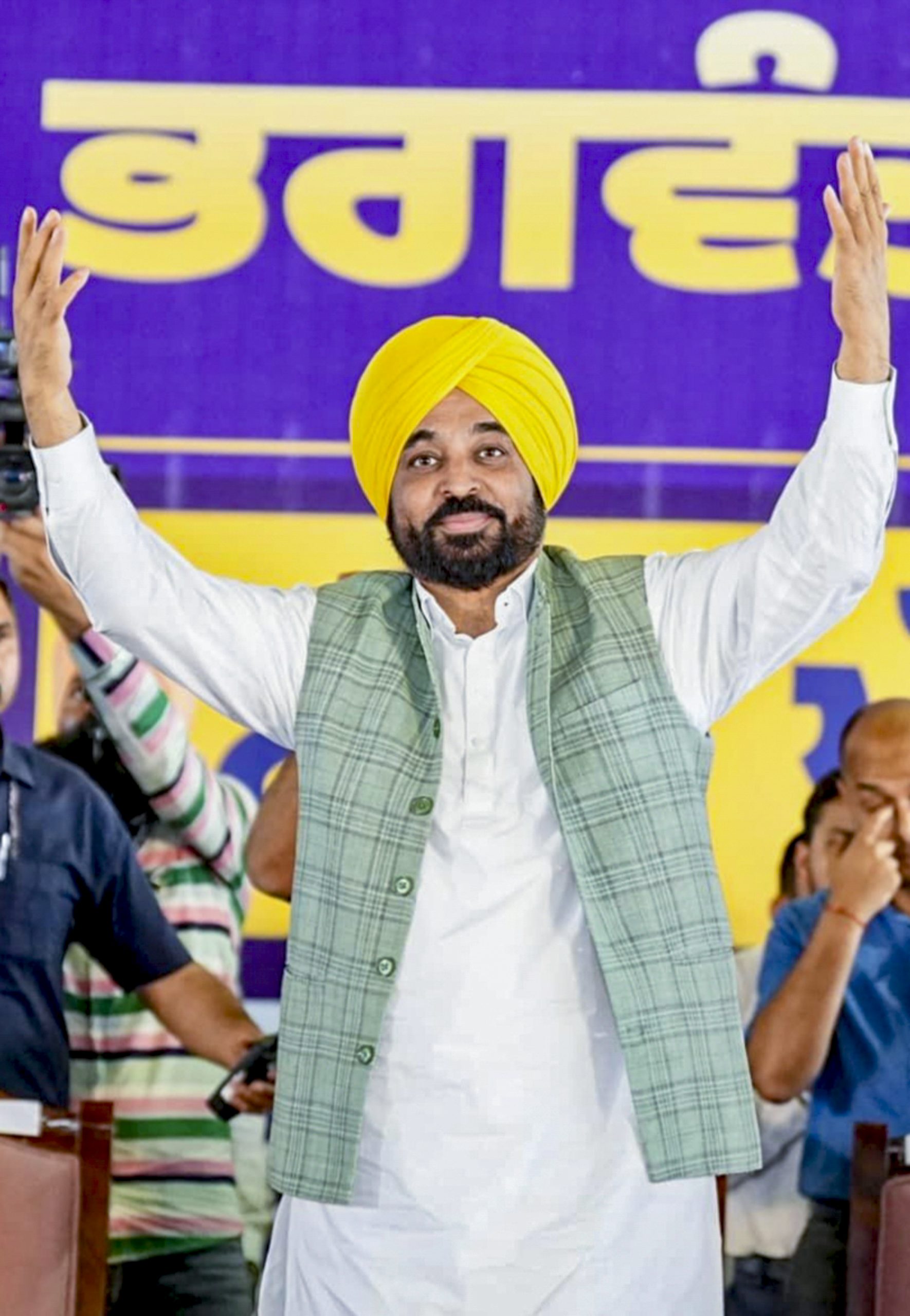 Patiala: Punjab Chief Minister Bhagwat Mann greets the gathering during a public meeting at Dudhan Sadhan, in Patiala district, Monday, March 30, 2026. (PTI Photo) (PTI03_30_2026_000321B)