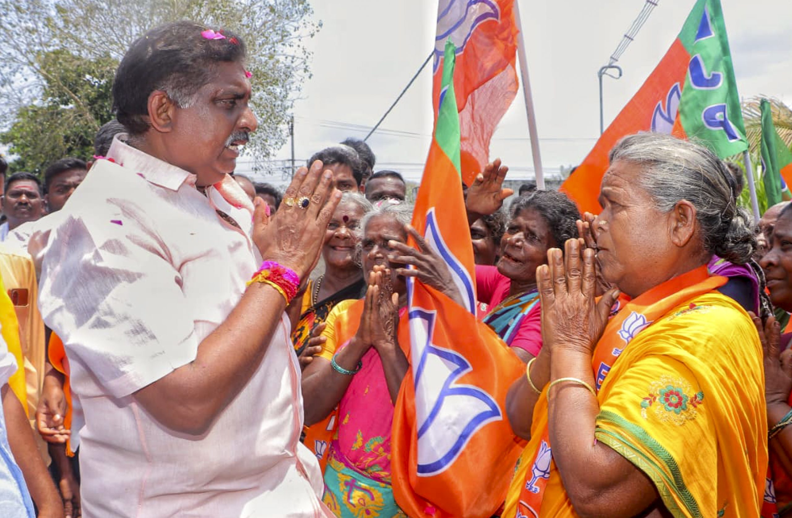 Puducherry: Puducherry Home Minister A. Namassivayam greets the supporters during an election campaign in the Vadhanur area under the Mannadipet constituency ahead of the Puducherry Assembly Election, Tuesday. (PTI Photo)