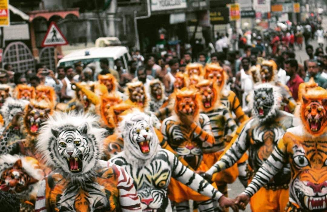 Onam, the 10-day festival, has Pulikali on the fourth day called as Naalaam Onam. Pulikali is where men will decorate themselves in vibrant colors and designs which make them look like tigers. They go on for a march around the city which is jam packed with thousands of visitors and tourists from all over the country.