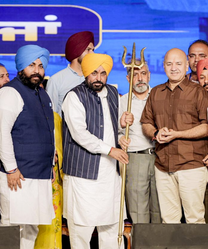 **EDS: THIRD PARTY IMAGE** In this image posted on March 31, 2026, Punjab Chief Minister Bhagwant Singh Mann, centre, holds a trident during the inauguration and the laying of foundation stones for various developmental projects, at Nangal, in Rupnagar district, Punjab. AAP leader Manish Sisodia, right, is also present. (@AAPPunjab/X via PTI Photo)(PTI03_31_2026_000282B)