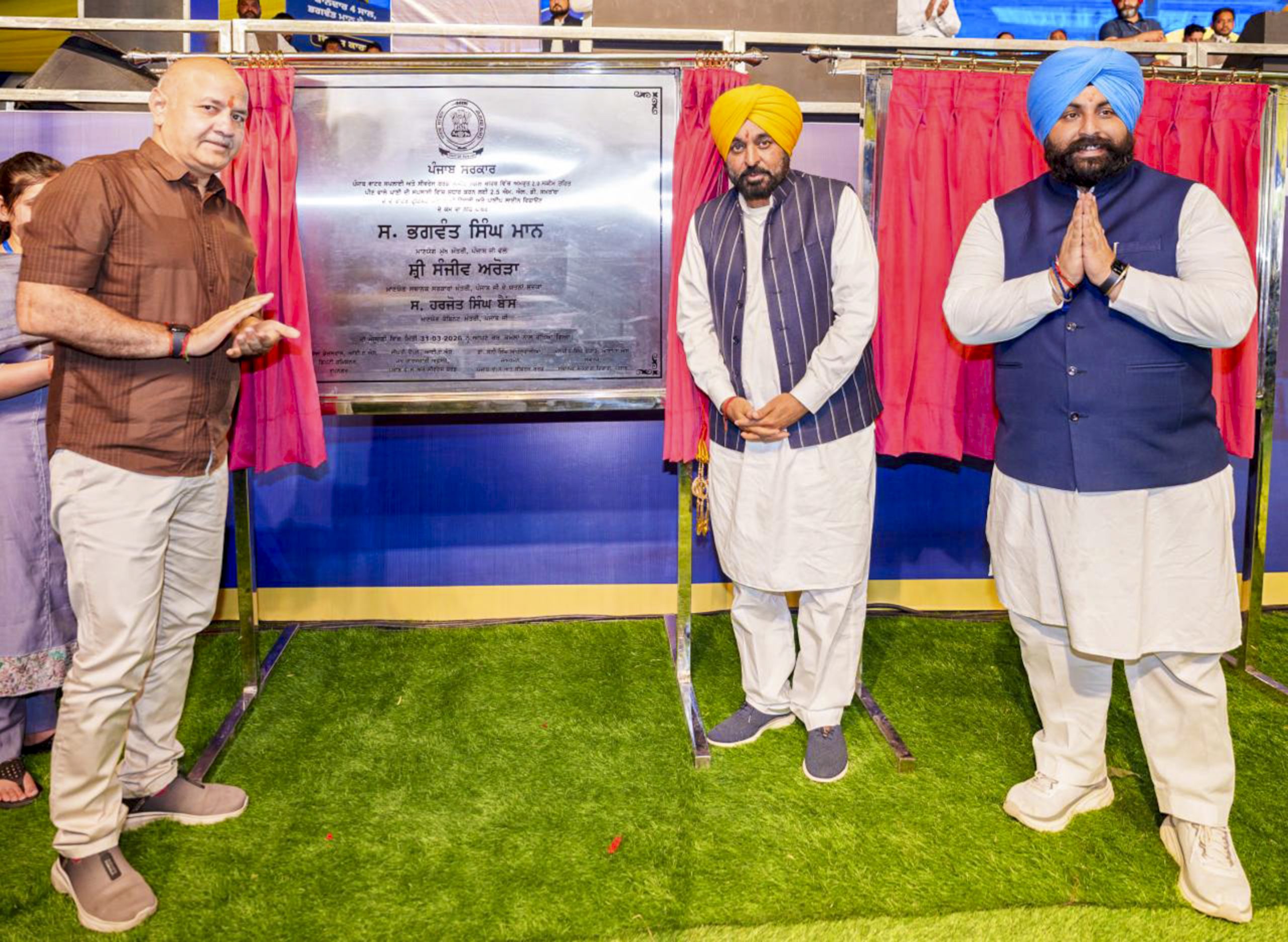 **EDS: THIRD PARTY IMAGE** In this image posted on March 31, 2026, Punjab Chief Minister Bhagwant Singh Mann, centre, inaugurates and lays the foundation stones for various developmental projects, at Nangal, in Rupnagar district, Punjab. AAP leader Manish Sisodia, left, is also present. (@AAPPunjab/X via PTI Photo)(PTI03_31_2026_000281B)