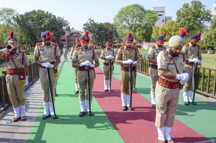 Amritsar: Punjab Police personnel pay tribute to freedom fighters who lost their lives in the 1919 Jallianwala Bagh massacre, at the memorial, in Amritsar, Sunday, April 13, 2025. (PTI Photo/Shiva Sharma) (PTI04_13_2025_000277B) *** Local Caption ***