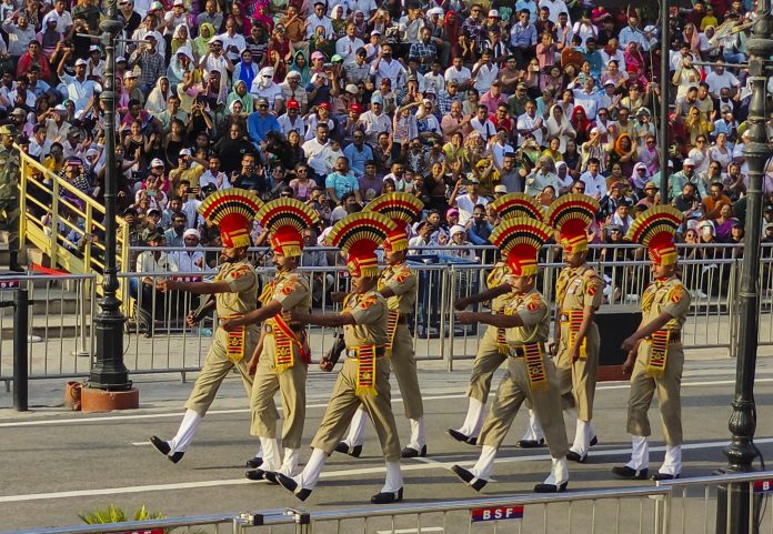 The Indian flag is lowered every evening by BSF troops in synchronisation with Pakistan Rangers at the joint check posts located at Attari (Amritsar district) opposite Pakistan’s Wagah, Hussainiwala in Ferozepur district across Ganda Singh Wala and at Sadki in Fazilka district. PTI NES KVK KVK