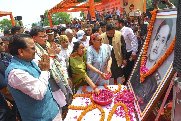 Udham Singh Nagar: Uttarakhand Chief Minister Pushkar Singh Dhami pays tribute to a martyr during the ‘Sainik Samman Samaroh’ at Khatima in Udham Singh Nagar, Wednesday, Apr. 9, 2025. (PTI Photo) (PTI04_09_2025_000417B)