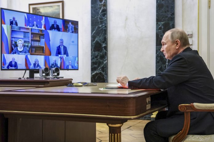 Russian President Vladimir Putin chairs a Security Council meeting via videoconference at the Kremlin in Moscow, Russia, Friday, May 30, 2025. AP/PTI(AP05_30_2025_000309B)
