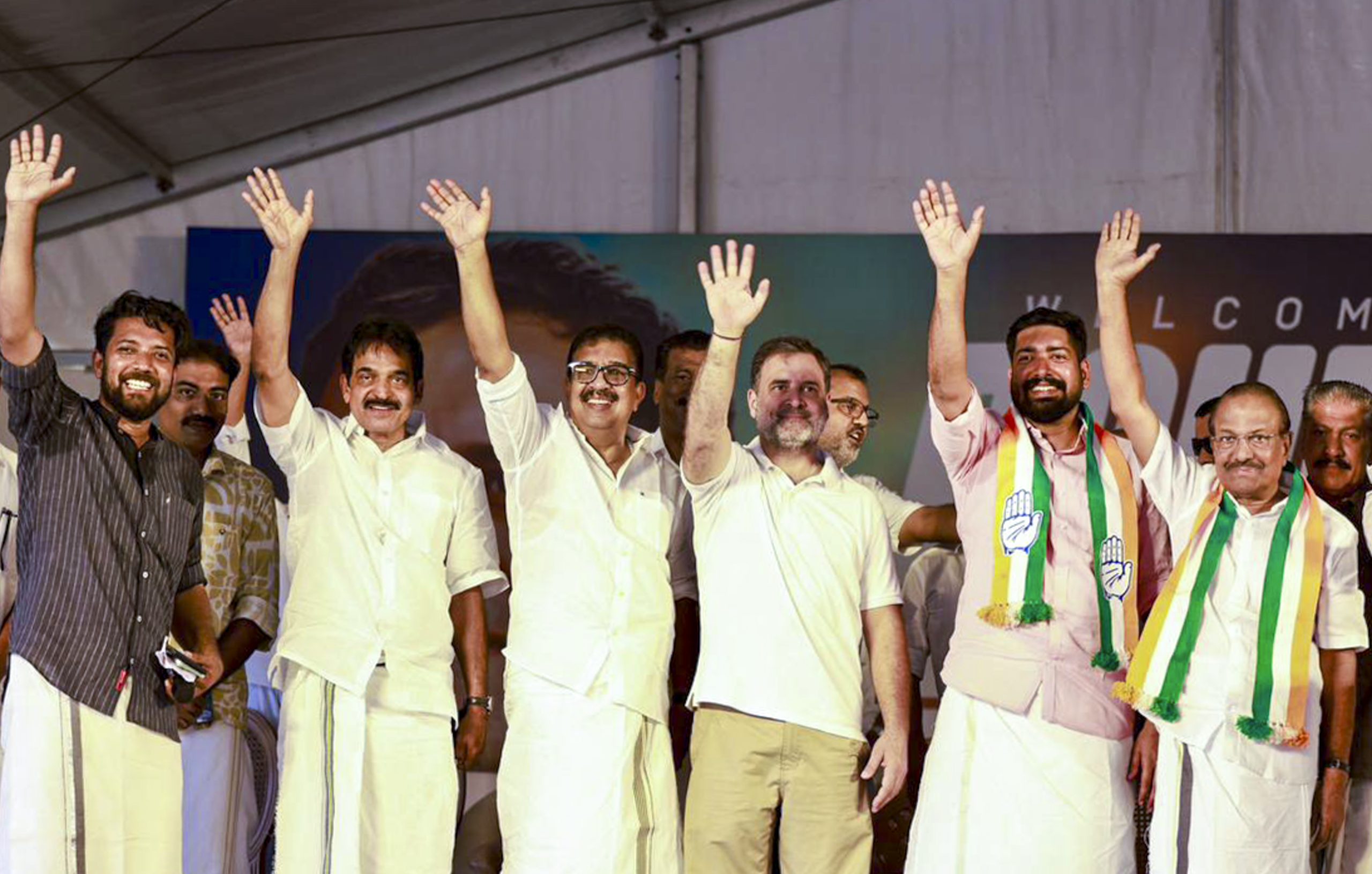 **EDS: THIRD PARTY IMAGE** In this image posted on March 31, 2026, Leader of Opposition in the Lok Sabha Rahul Gandhi with party leaders during a public meeting ahead of the Kerala assembly elections, in Kallachi, Kerala. (@INCIndia/X via PTI Photo)(PTI03_31_2026_000166B)